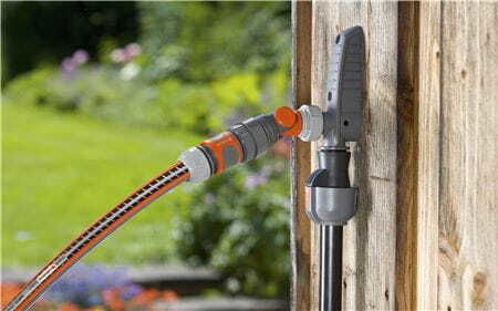 Η σύνδεση του νερού χρησιμεύει ως ένα υπέργειο σημείο εισαγωγής νερού. Μπορεί να τοποθετηθεί σε τοίχο ή στο έδαφος με μια καρφίτσα. Το νερό λαμβάνεται μέσω του σωλήνα εγκατάστασης και αντικαθιστά βασικά τη βρύση. Το πότισμα μπορεί να ξεκινήσει αμέσως μετά τη σύνδεση του εύκαμπτου σωλήνα με μια αυτόματη βαλβίδα διακοπής. Όταν αποσυνδεθεί ο εύκαμπτος σωλήνας, η ροή του νερού διακόπτεται αυτόματα.