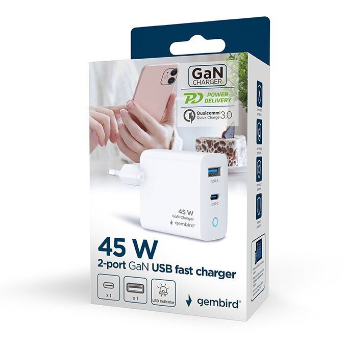 Gembird Φορτιστής Χωρίς Καλώδιο GaN με Θύρα USB-A και Θύρα USB-C 45W Power Delivery / Quick Charge 3.0 Λευκός (TA-UC-PDQC45L-W-01)