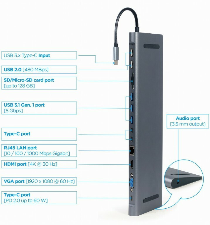 - Λειτουργίες 9 σε 1: Διανομέας USB, βίντεο 4K HDMI και Full HD VGA, στερεοφωνικός ήχος, θύρα LAN Gigabit, συσκευή ανάγνωσης καρτών και υποστήριξη φόρτισης USB Type-C PD.