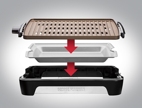 Η πλάκα ψησίματος είναι σχεδιασμένη ώστε να κατευθύνει το καυτό λίπος στη θήκη που βρίσκεται στο κάτω μέρος, δροσίζοντας την πλάκα ψησίματος και εξαλείφοντας τον καπνό και τη μυρωδιά δημιουργείται από την καύση του λίπους.