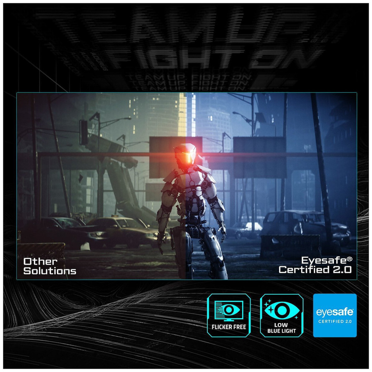 Άλλες λύσεις ρυθμίζουν το μπλε φως μετατοπίζοντας το χρώμα σε θερμότερες αποχρώσεις. Το πιστοποιημένο Eyesafe® 2.0 μειώνει το μπλε φως υψηλής ενέργειας, διατηρώντας παράλληλα την απόδοση των χρωμάτων.