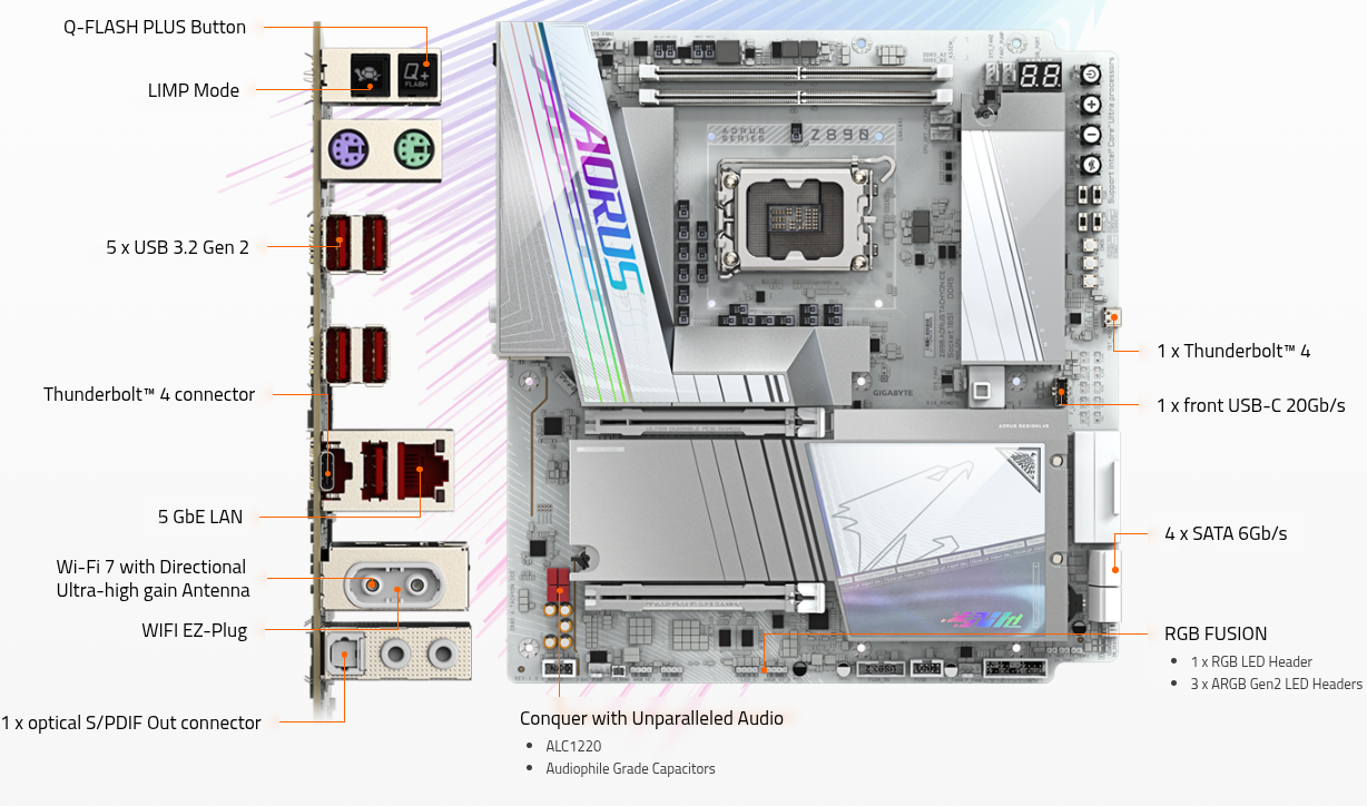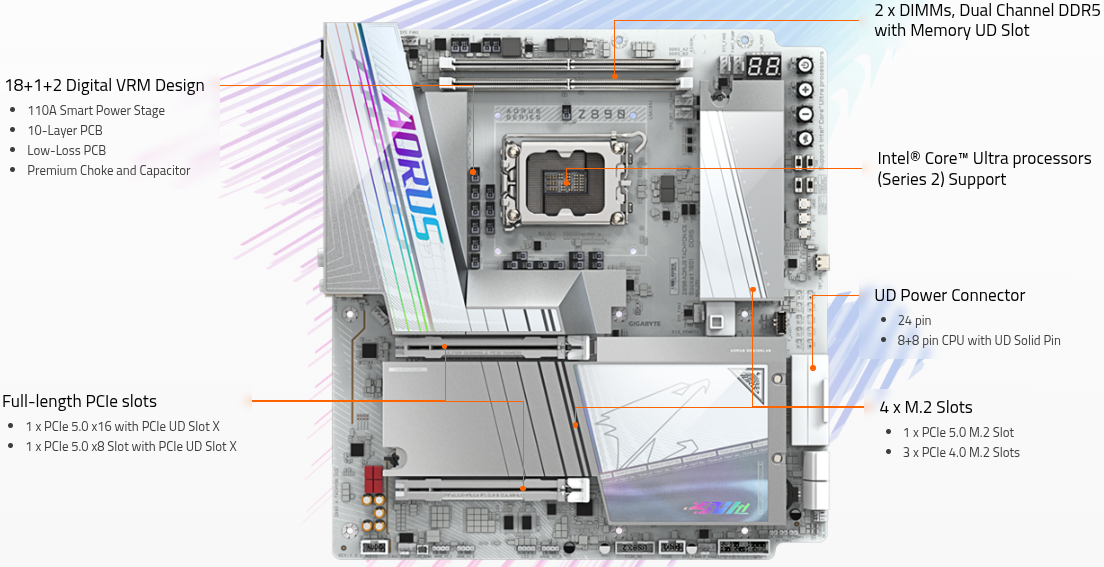Διαθέτει PCI-Express 5.0 16x για τις κάρτες γραφικών, υποστήριξη M.2 PCIe 4.0/5.0 SSDs για ταχύτερους χρόνους φόρτωσης και DDR5 RAM για υψηλή ταχύτητα μνήμης.