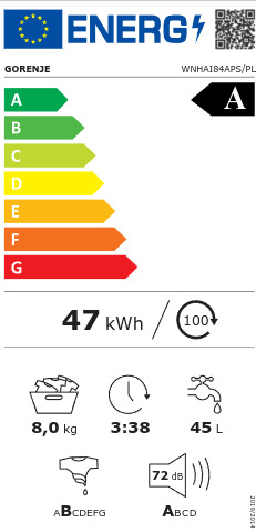 • Κατανάλωση ενέργειας ανά 100 κύκλους: 47 kWh
