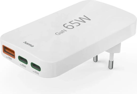 HAMA Φορτιστής Χωρίς Καλώδιο GaN με Θύρα USB-A και 2 Θύρες USB-C 65W Power Delivery / Quick Charge 3.0 Λευκός (201976)