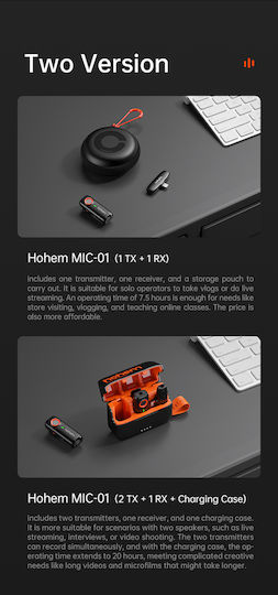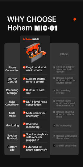 Tο μικρόφωνο Hohem MIC-01 προσφέρει απόλυτη ευελιξία και αξιοπιστία σε διάφορες δημιουργικές συνθήκες. Με την εύκολη σύνδεση και την εξαιρετική συμβατότητα με smartphones, τάμπλετ και φορητούς υπολογιστές, προσφέρει απρόσκοπτη λειτουργία και ασφαλή εγγραφή. Βασικό χαρακτηριστικό του, η τεχνολογία ακύρωσης θορύβου που εξασφαλίζει κρυστάλλινο ήχο ακόμα και σε δύσκολε συνθήκες . Με απλή εγκατάσταση και συνεχή υποστήριξη από τα Hohem Gimbal, το MIC-01 αποτελεί την τέλεια λύση για όσους αναζητούν υψηλή ποιότητα ήχου και ευκολία στη χρήση, ενώ επιτρέπει τη δημιουργία συναρπαστικών περιεχομένων με άνεση και ακρίβεια.