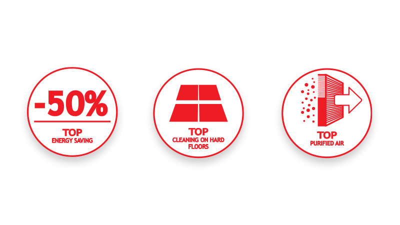 ✔ Η τεχνολογία Single Cyclone και το Performance System 3 TOP Eco εξασφαλίζουν υψηλή απόδοση, οικονομία ενέργειας και καθαρό αέρα, ενώ τα ενσωματωμένα αξεσουάρ 2-σε-1 κάνουν τη φροντίδα του σπιτιού παιχνιδάκι.