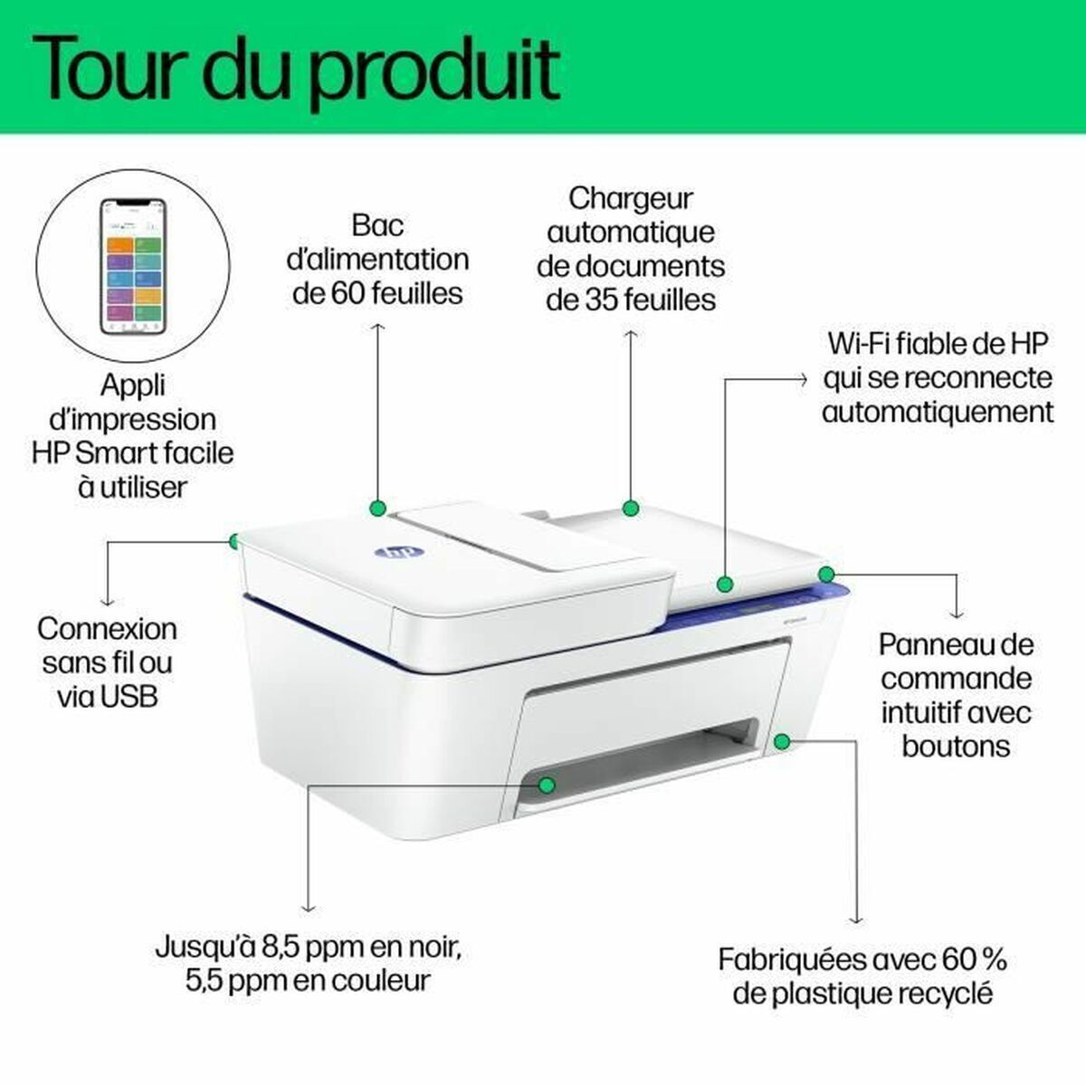 Σαρώστε/αντιγράψτε εύκολα πολλαπλές σελίδες με τον αυτόματο τροφοδότη εγγράφων. Εξασφαλίστε ότι θα είστε πάντα έτοιμοι να εκτυπώσετε με το πιο αξιόπιστο Wi-Fi® που συνδέεται ξανά αυτόματα αν χαθεί η σύνδεση. Επιλέξτε εκτυπωτές με 60% ανακυκλωμένο πλαστικό και συμβάλετε στην προστασία των δασών μας με κάθε σελίδα που εκτυπώνετε. Ορισμένοι εκτυπωτές προορίζονται να λειτουργούν μόνο με δοχεία που διαθέτουν καινούργιο ή επαναχρησιμοποιούμενο ηλεκτρονικό κύκλωμα. Αυτοί οι εκτυπωτές χρησιμοποιούν μέτρα δυναμικής ασφάλειας για τον αποκλεισμό δοχείων με μη αυθεντικά κυκλώματα. Οι περιοδικές ενημερώσεις υλικολογισμικού διατηρούν την αποτελεσματικότητα αυτών των μέτρων. Τα επαναχρησιμοποιούμενα ηλεκτρονικά κυκλώματα επιτρέπουν τη χρήση επαναχρησιμοποιούμενων, ανακατασκευασμένων και ξαναγεμισμένων δοχείων.