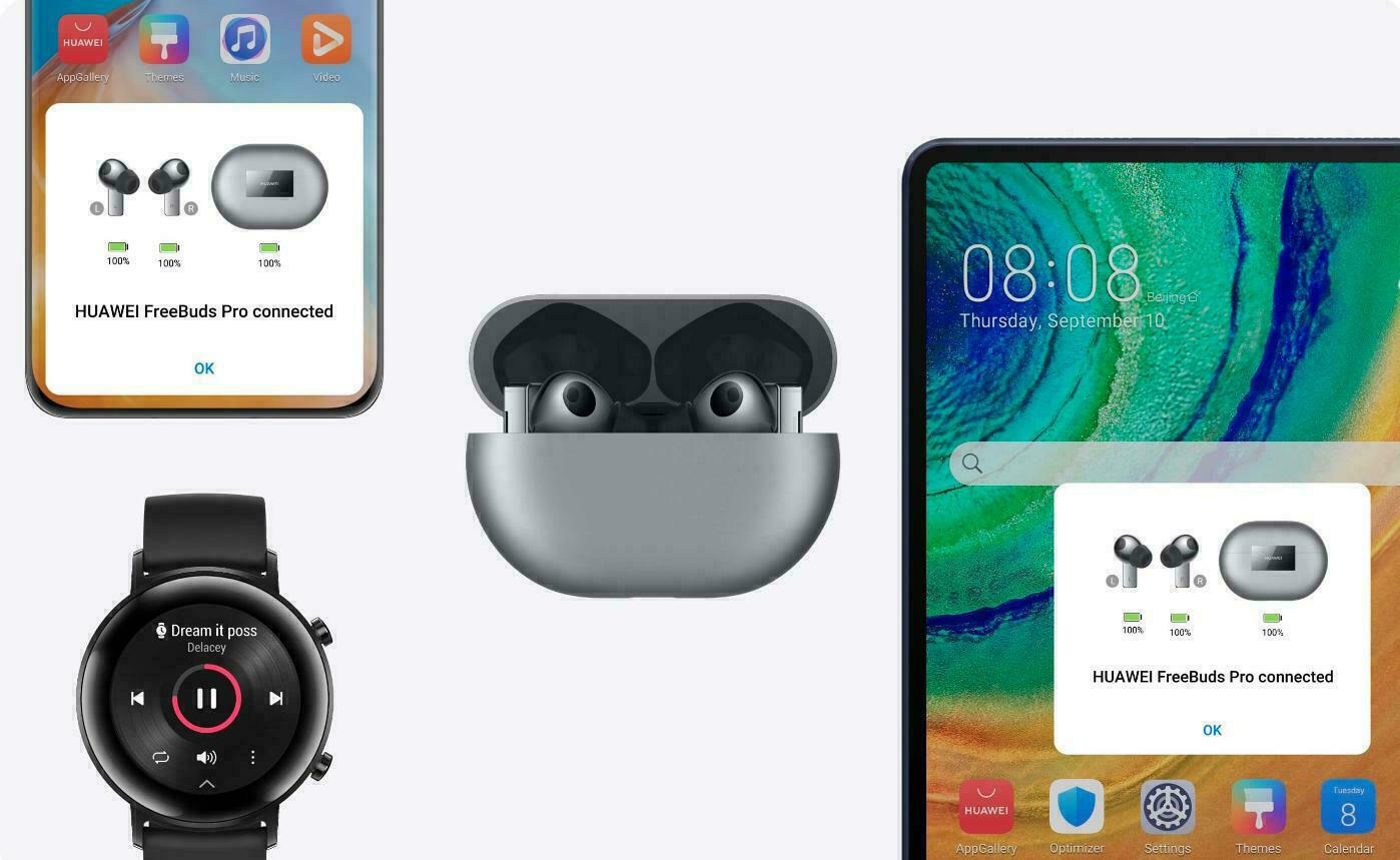Τα FreeBuds Pro μπορούν να συνδεθούν ταυτόχρονα με δύο συσκευές. Με τη διπλή σύνδεσή που υποστηρίζει smartphone, tablet, υπολογιστές και άλλες έξυπνες συσκευές, μπορείτε να παρακολουθήσετε ένα βίντεο στο tablet, αλλά εξακολουθείτε να είναι ανοιχτό για λήψη οποιωνδήποτε τηλεφωνικών κλήσεων με ένα μόνο τσίμπημα στέλεχος των ακουστικών. Δεν απαιτείται διακόπτης σύνδεσης.
