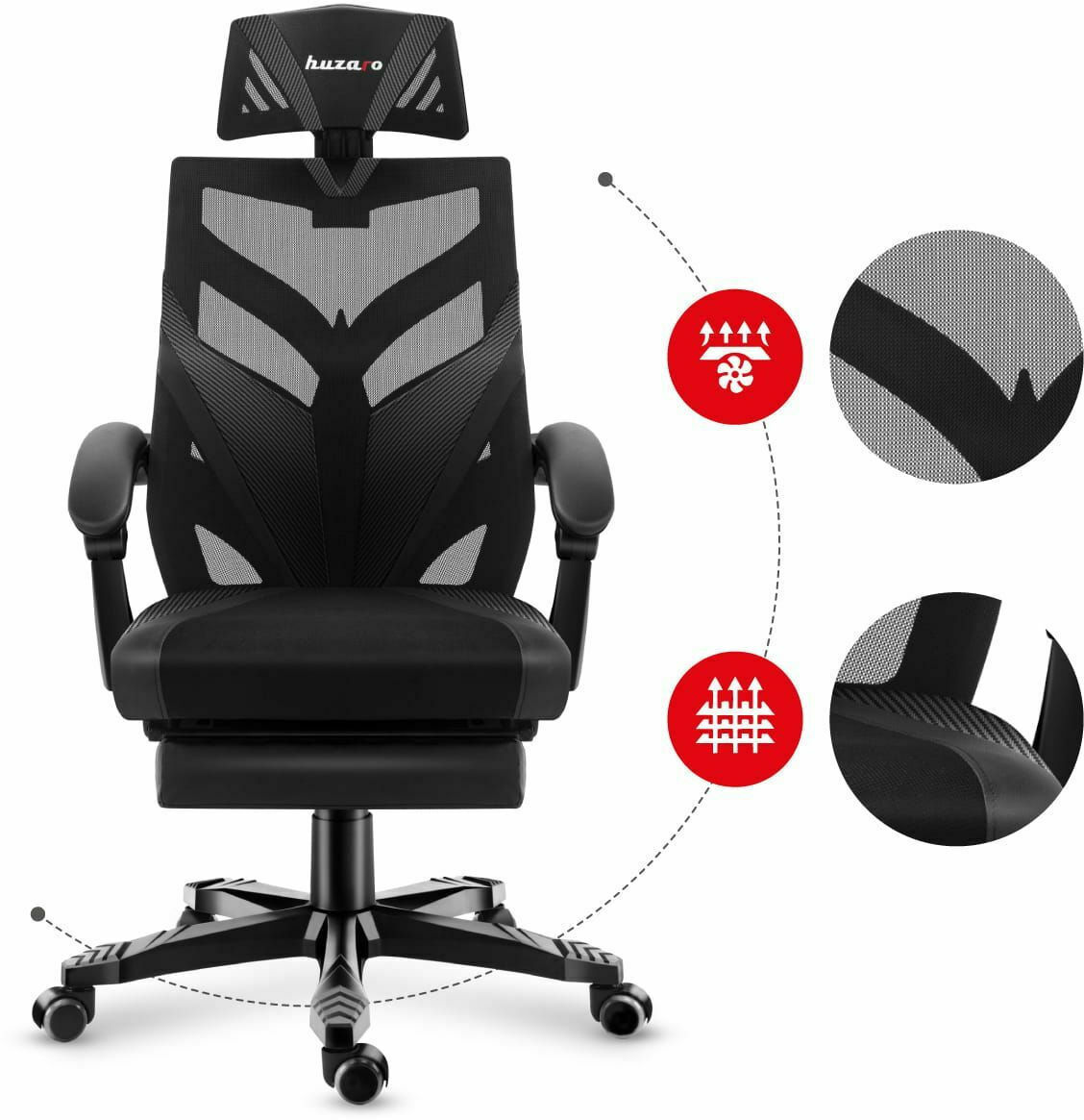 Η καρέκλα Gaming Huzaro Combat 5.0 Mesh θα σας προσφέρει ατελείωτες ώρες ξεκούραστου gaming, εργασίας ή διαβάσματος χάρη στον μοντέρνο εργονομικό σχεδιασμό. Η εξαιρετικής ποιότητας επένδυση με πλέγμα επιτρέπει στον αέρα να διαπερνά την πλάτη, ιδανική για τους ζεστούς μήνες του καλοκαιριού. Ακολουθούν τα χαρακτηριστικά της: