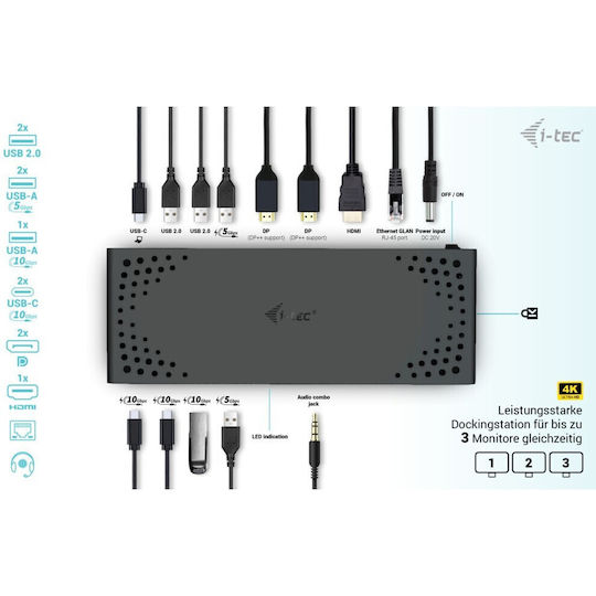 i-tec USB-C Docking Station με HDMI/DisplayPort 4K PD Ethernet και σύνδεση 3 Οθονών Μαύρο (C31TRIPLE4KDOCKPD)