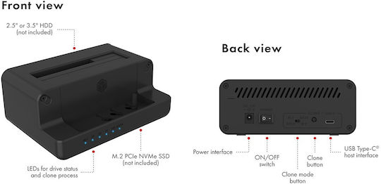 Έτσι μπορείτε εύκολα να κάνετε cloning από HDD/SSD 2,5″/3,5″ σε M.2 NVMe ή από M.2 NVMe σε HDD/SSD 2,5″/3,5″. Η τοποθέτηση και αφαίρεση των σκληρών δίσκων πραγματοποιείται εύκολα και γρήγορα χωρίς τη χρήση επιπλέον εργαλείων.