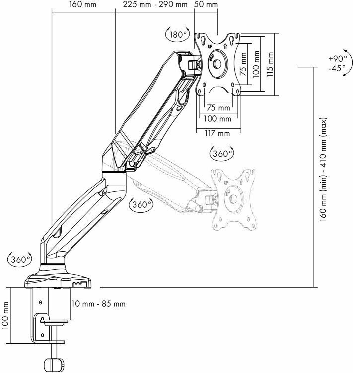 Βραχίονας κλίσης και περιστροφής μίας οθόνης έως και 27″ και βάρους έως και 6,5 κιλών με τοποθέτηση γραφείου.