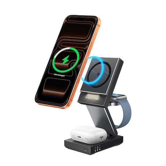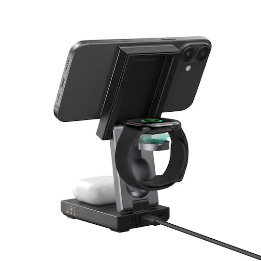 Ο φορτιστής αυτός είναι μια αναδιπλούμενη ασύρματη βάση φόρτισης 3-σε-1 που φορτίζει ταυτόχρονα ένα smartphone συμβατό με Qi2, ακουστικά TWS και ένα συνδεδεμένο ρολόι. Ο κύριος μηχανισμός περιλαμβάνει ισχυρή μαγνητική ευθυγράμμιση για τη σταθεροποίηση του τηλεφώνου κατά τη φόρτιση. Η κάτω πλευρά φορτίζει τα ακουστικά επαγωγικά, ενώ η πλευρική βάση κρατά το ρολόι.