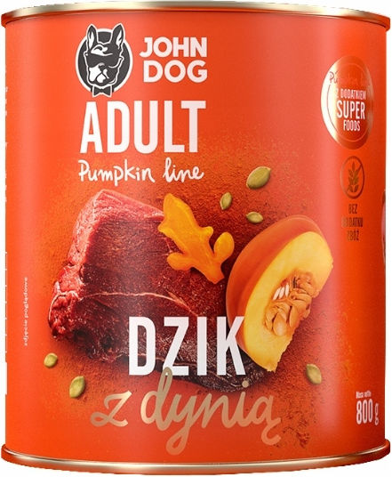 Υγρή τροφή σκύλων Pumpkin Line 800 g με άγριο χοίρο και κολοκύθα. Η τροφή είναι 100% φυσική, χωρίς δημητριακά, και χωρίς τεχνητές χρωστικές και συντηρητικά. Αποτελεί ολοκληρωμένη τροφή για ενήλικους σκύλους όλων των φυλών.