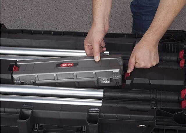 Φορητό τραπέζι JOBMADE μαύρο/κόκκινο. Το πολυλειτουργικό τραπέζι κατασκευάστηκε από πλαστικό υψηλής ποιότητας, πολυπροπυλένιο. Χρειάζεται ελάχιστη συντήρηση, αρκεί να το καθαρίσετε με ένα υγρό πανί. Η επιφάνεια εργασίας είναι ανθεκτική στις καιρικές συνθήκες και την υπεριώδη ακτινοβολία.
