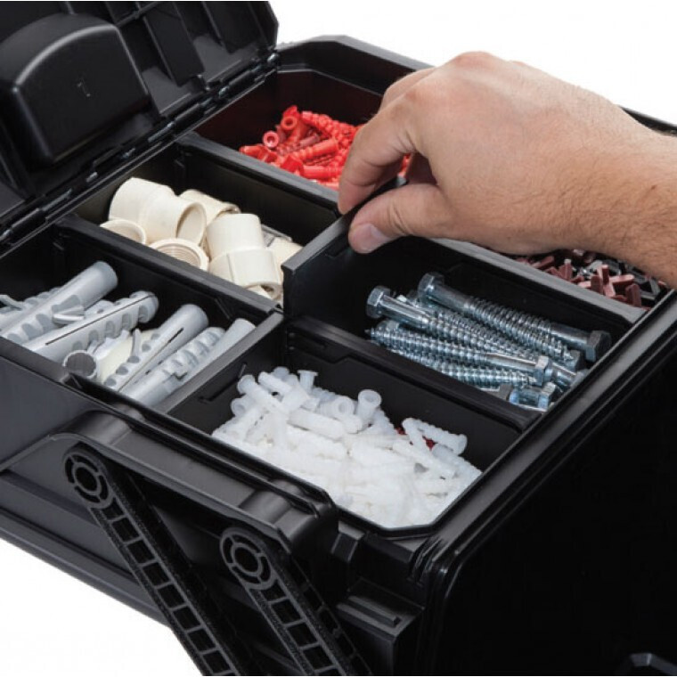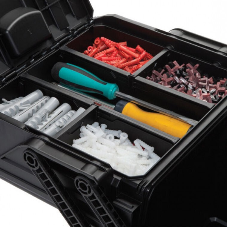 - Διαθέτει μεταλλικό χερούλι μεταφοράς, μεταλλικούς μεντεσέδες, ειδική υποδοχή για λουκέτο, έως 12 θέσεις για τα εργαλεία και λαστιχένιες ρόδες