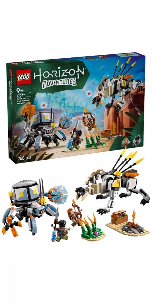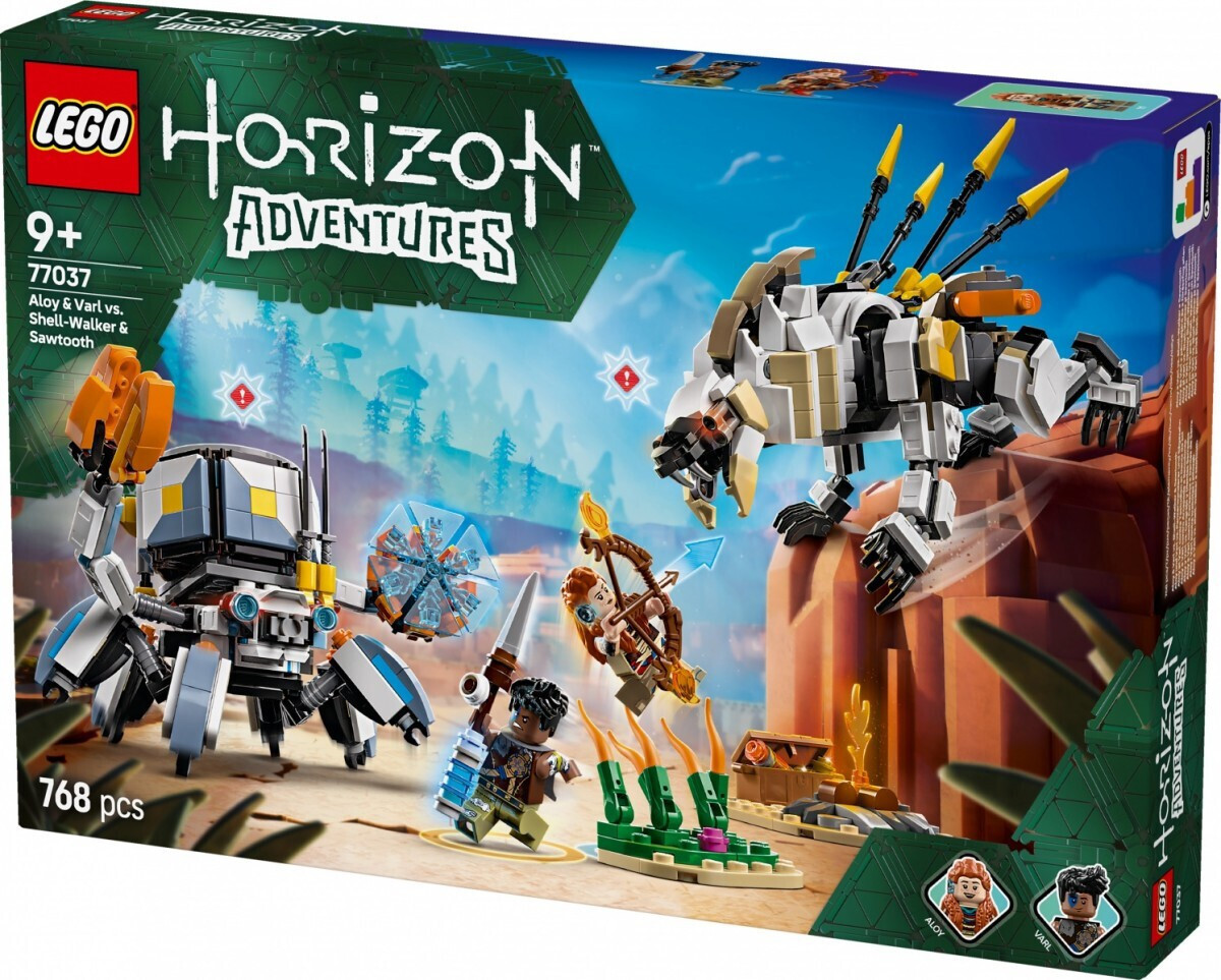 Το LEGO® Horizon Adventures Aloy & Varl vs. Shell-Walker & Sawtooth (77037) είναι ένα συλλεκτικό παιχνίδι με θέμα ένα βιντεοπαιχνίδι. Βασισμένο στο βιντεοπαιχνίδι LEGO Horizon Adventures, αυτό το σετ περιλαμβάνει 2 μίνι φιγούρες, την Aloy και τον Varl. Η Aloy έχει ένα τόξο και ο Varl δόρυ. Κάθε όπλο διαθέτει αναβαθμίσεις που μπορούν να προσθέσουν επιθέσεις φωτιάς, πάγου ή ηλεκτροσόκ. Περιλαμβάνει επίσης 2 κατασκευάσιμα ρομποτικά πλάσματα.