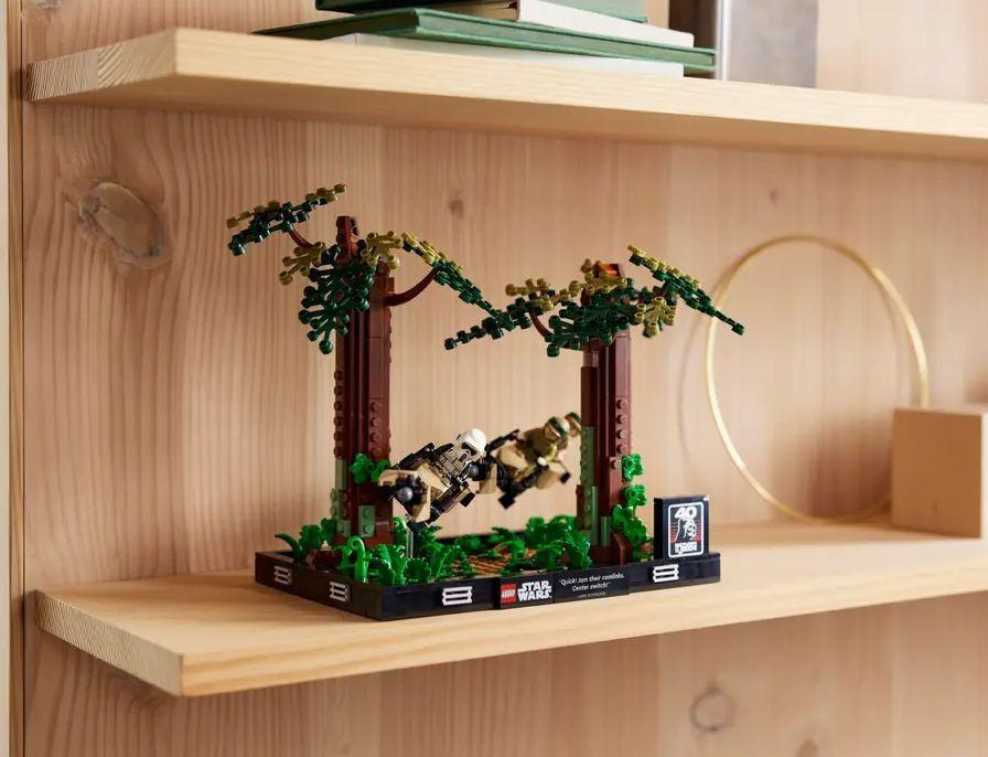 Κατασκευάστε ένα δυναμικό στιγμιότυπο από την καταδίωξη της Πριγκίπισσας Λέια και του Λουκ Σκαϊγουόκερ από έναν Ανιχνευτή στο Δασωμένο Φεγγάρι του Έντορ. Αναπαραστήστε την εμφάνιση του δάσους με κατασκευάσιμα δέντρα και τα νέα στοιχεία φτέρης. Στήστε τα ταχυσκάφη υπό γωνία, σαν να ελίσσονται ανάμεσα στα δέντρα με υψηλή ταχύτητα. Προσθέστε μια πινακίδα για την 40ή επέτειο του Star Wars: Η Επιστροφή των Τζεντάι και ολοκληρώστε ένα νοσταλγικό διακοσμητικό κομμάτι.