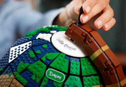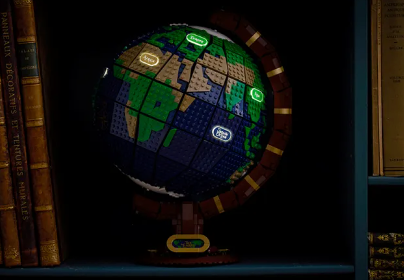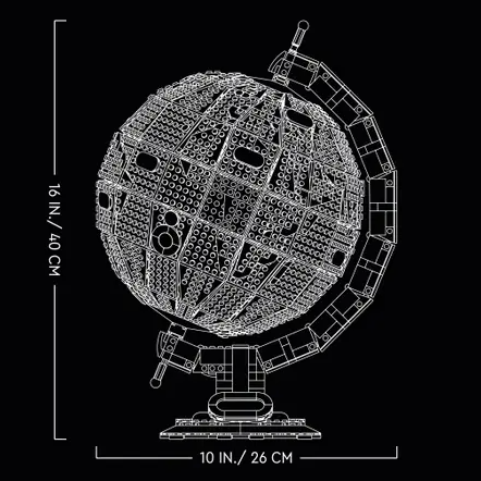 Αυτό το μοντέλο που δημιουργήθηκε από έναν θαυμαστή-σχεδιαστή και ήρθε στον κόσμο από την ομάδα LEGO® Ideas, αναπαριστά την περιστροφική κίνηση μιας παλιάς γήινης σφαίρας με τη βοήθεια στοιχείων LEGO Technic™ και διαθέτει φωσφορίζοντα πλακίδια διακοσμημένα με τα ονόματα των ηπείρων και των ωκεανών.