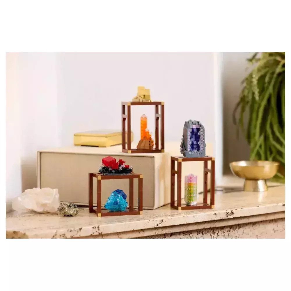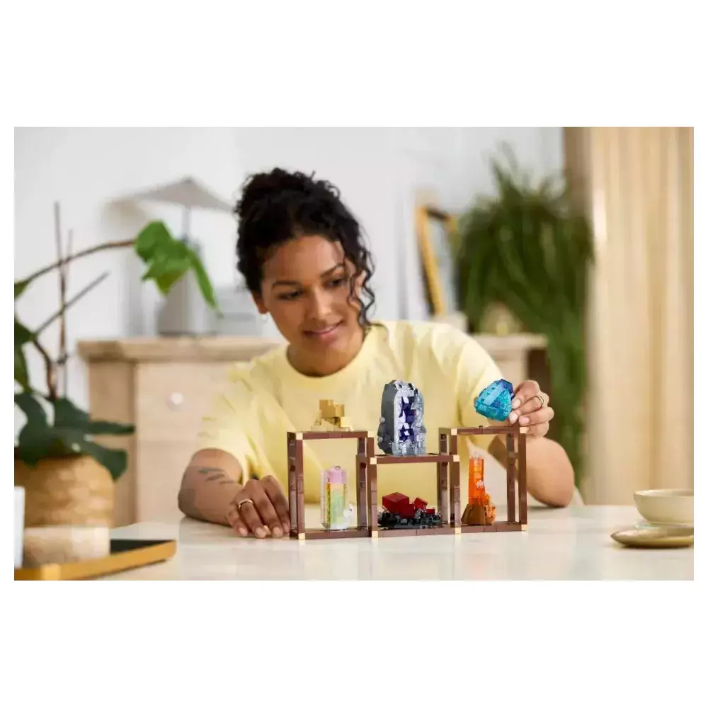 Χάρη σε έξυπνες τεχνικές κατασκευής και διαφανή τουβλάκια LEGO, τα ορυκτά αποκτούν λάμψη και ρεαλισμό. Τα τρία ανεξάρτητα ράφια που περιλαμβάνονται μπορούν να τοποθετηθούν μαζί ή ξεχωριστά, ενώ τα ορυκτά μπορούν να ανταλλαγούν ελεύθερα για να δημιουργήσουν μια εξατομικευμένη διάταξη.