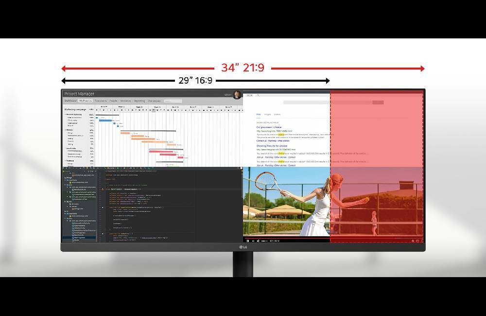 Η οθόνη UltraWide™ Full HD (2560×1080) προσφέρει περισσότερο οριζόντιο χώρο από μια τυπική οθόνη FHD (1920×1080). Ο σχεδιασμός με σχεδόν ανύπαρκτα περιθώρια παρέχει μια αδιάκοπη, ευρύτερη θέα. Αυτό επιτρέπει πιο αποδοτικό multitasking χωρίς την ανάγκη αλλαγής μεταξύ παραθύρων.