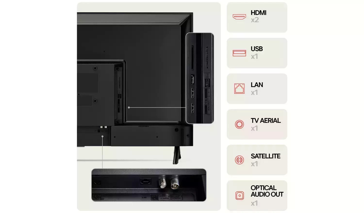 Επιπλέον, η τηλεόραση αυτή διαθέτει αρκετές θύρες HDMI και USB για σύνδεση με άλλες συσκευές, όπως κονσόλες παιχνιδιών ή συσκευές αποθήκευσης.