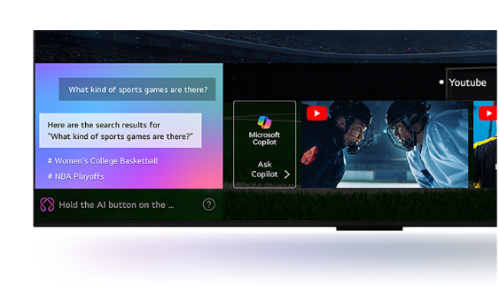 Ζητήστε από την τηλεόρασή σας οτιδήποτε. Το ενσωματωμένο AI αναγνωρίζει τη φωνή σας και παρέχει γρήγορα εξατομικευμένες προτάσεις για τα αιτήματά σας. Μπορείτε να λάβετε επίσης επιπλέον αποτελέσματα και λύσεις με το Microsoft Copilot.