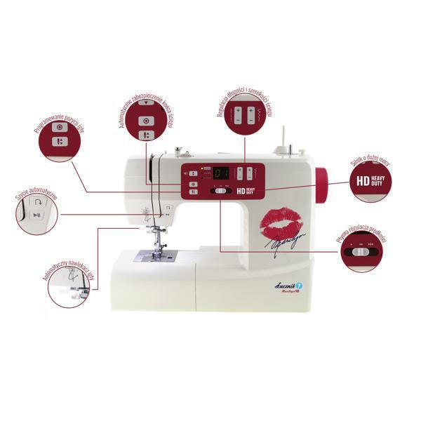 Εκτός από τις λειτουργίες που έχουν ήδη αναφερθεί, το Lucznik Marilyn σάς επιτρέπει να ράβετε χωρίς να χρειάζεται να χρησιμοποιήσετε το πεντάλ (κουμπί έναρξης / διακοπής), να ρυθμίσετε την ταχύτητα ραφής στη μηχανή ή, για παράδειγμα, να τοποθετήσετε τη βελόνα πάνω-κάτω χρησιμοποιώντας το κουμπί. Η οθόνη LED δείχνει καθαρά τον αριθμό της επιλεγμένης βελονιάς. Στο μηχάνημα μπορούμε να ρυθμίσουμε το μήκος και το πλάτος της βελονιάς, ή. Ρυθμίστε την τάση του άνω νήματος. Η ενσωματωμένη κλωστή βελόνας βοηθά να περάσει το νήμα μέσα από το μάτι της βελόνας. Το HD (Heavy Duty) σημαίνει ενισχυμένο πλαίσιο μηχανής.