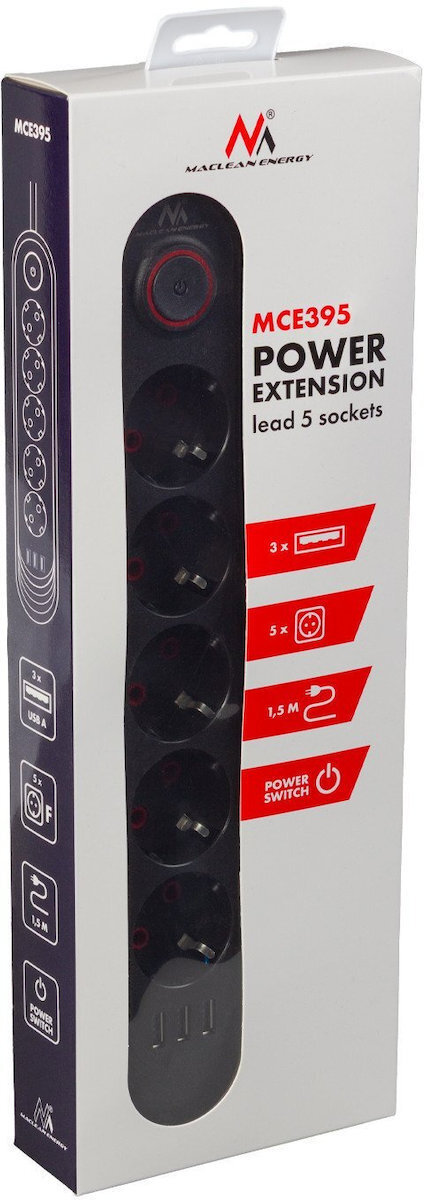 Αυτό το πολύπριζο διαθέτει πέντε υποδοχές, παρέχοντας έτσι την ικανότητα να συνδέσεις πολλές συσκευές ταυτόχρονα. Το καλώδιο έχει μήκος 1.5 μέτρα, προσφέροντας ευελιξία στη διάταξη των ηλεκτρικών σου συσκευών. Με μέγιστο φορτίο 2500 Watt, μπορείς να είσαι σίγουρος ότι θα υποστηρίξει όλες τις απαιτήσεις σου χωρίς να υπερθερμανθεί. Επιπλέον, διαθέτει τρεις υποδοχές USB-A, διευκολύνοντας τη φόρτιση των κινητών και άλλων συσκευών σου.