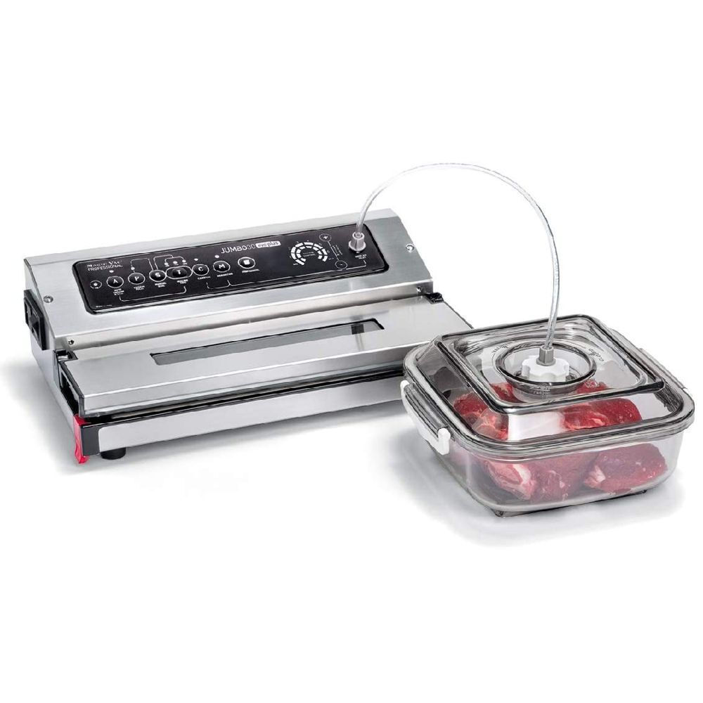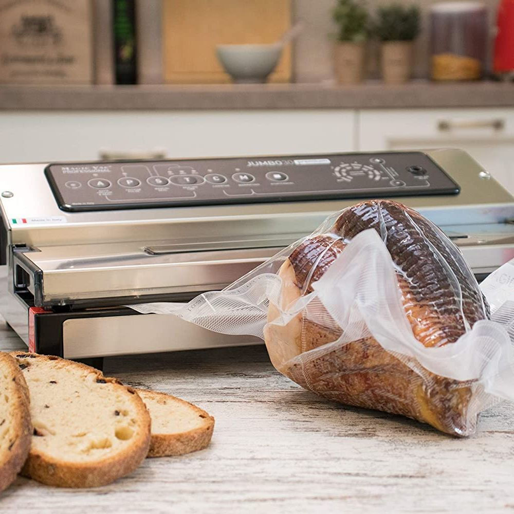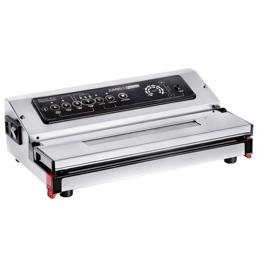 Η σφραγιζόμενη συσκευή MAGICVAC Jumbo 30 Premium προσφέρει επαγγελματική λύση για την αποθήκευση τροφίμων. Με στιβαρή κατασκευή από ανοξείδωτο χάλυβα και ισχυρή διπλή αντλία με υπερμεγέθη κινητήρα, αυτή η συσκευή επιτυγχάνει μέγιστη έξοδο κενού 28 λίτρα ανά λεπτό. Ιδανική για εντατική χρήση στην κουζίνα.
