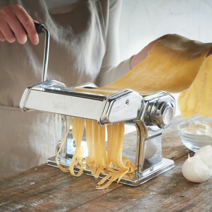 Mηχανή φύλλου & ζυμαρικών από επινικελωμένο ατσάλι, για μέγιστη αντοχή στο χρόνο. Διαθέτει μανιβέλα με μεταλλική χειρολαβή για ευκολία στη χρήση, σφιγκτήρα που εφαρμόζει στο τραπέζι ή στον πάγκο της κουζίνας για μεγαλύτερη σταθερότητα και ρυθμιστή πάχους ζύμης 10 επιπέδων.