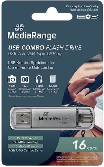Mediarange Usb 3.0 Combo Flash Drive Usb Type C 16gb Silver