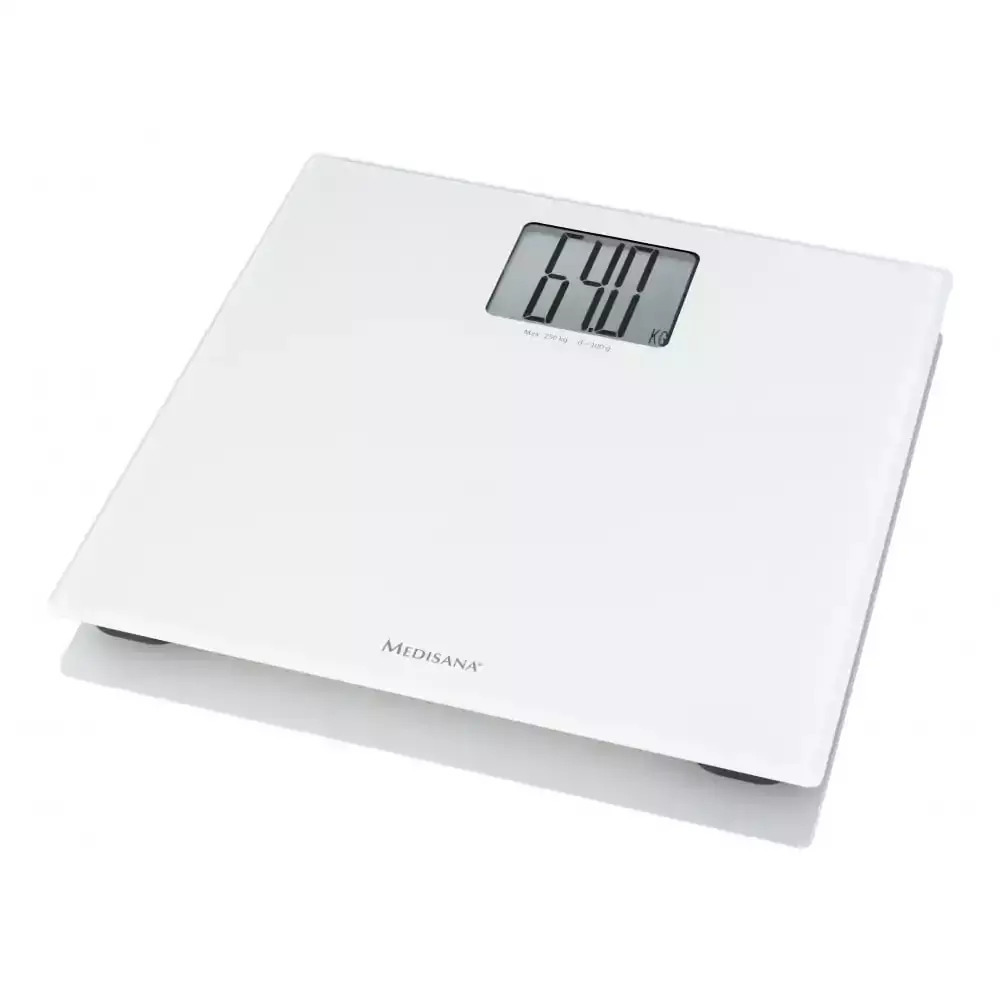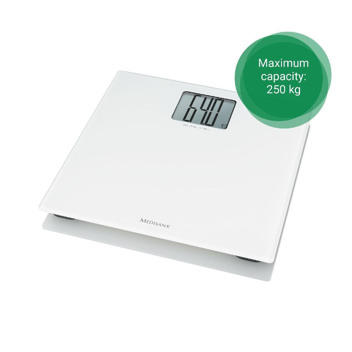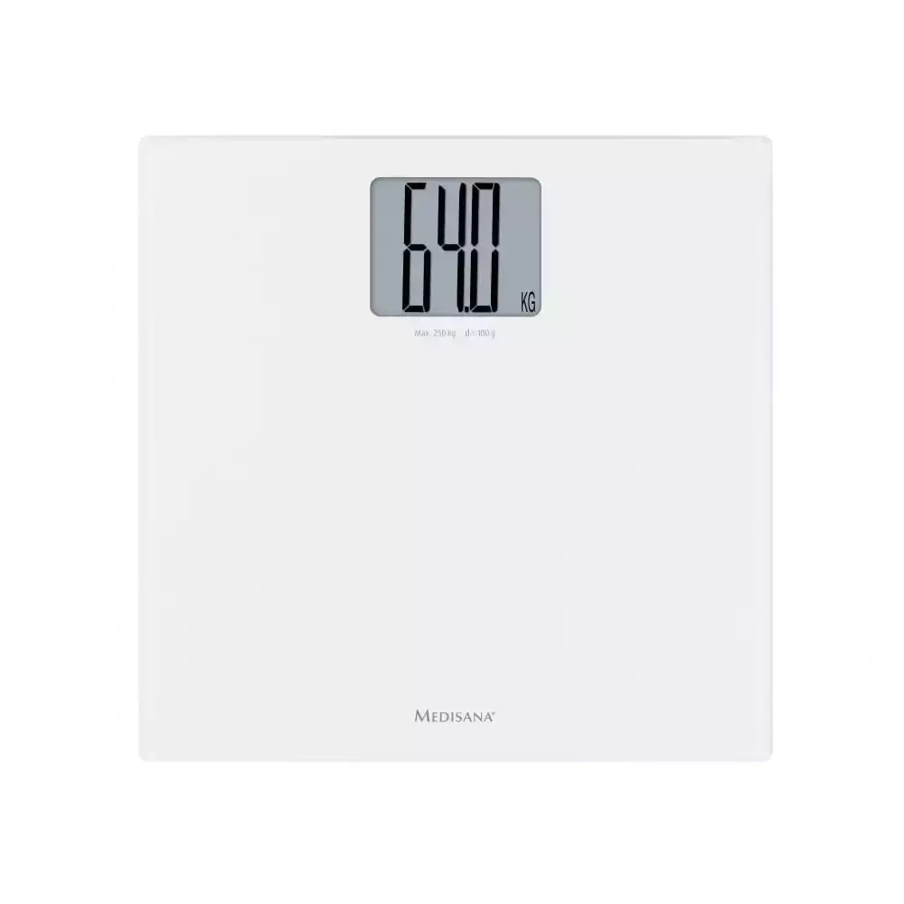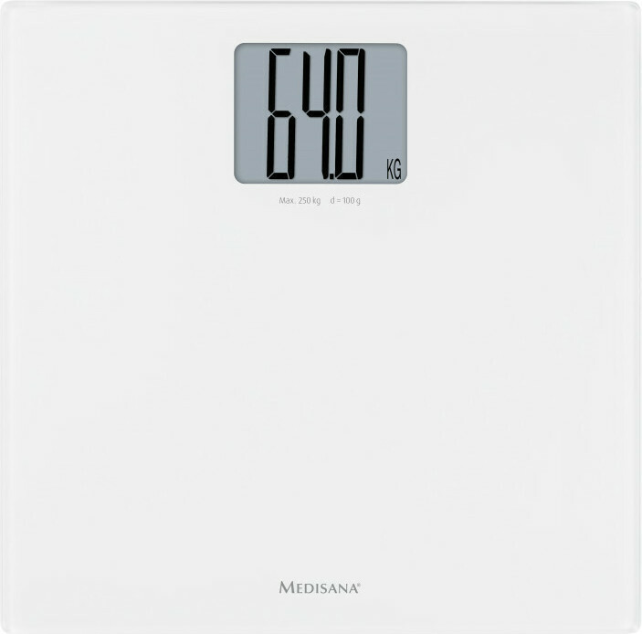 Ψηφιακή ζυγαριά μπάνιου σε λευκό χρώμα της εταιρείας Medisana, για μέτρηση του σωματικού βάρους έως και 250 κιλά.