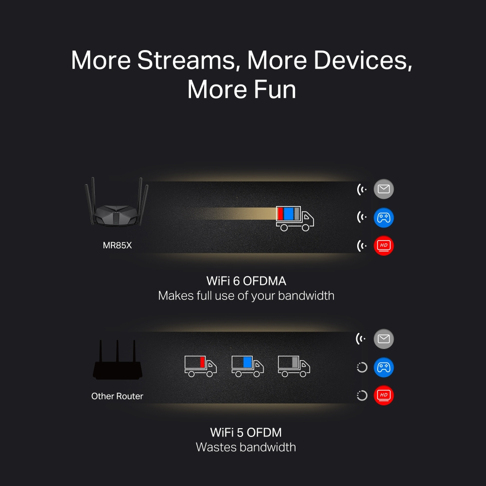 Το router Mercusys MR85X AX3000 διαθέτει ισχυρές κεραίες υψηλής απόδοσης με τεχνολογία Beamforming και υποστήριξη EasyMesh, προσφέροντας αξιόπιστη κάλυψη σε κάθε γωνιά του σπιτιού. Περιλαμβάνει θύρα Multi-Gigabit 2.5 Gbps και υποστηρίζει OFDMA & MU-MIMO, επιτρέποντας τη σύνδεση έως και 4 φορές περισσότερων συσκευών ταυτόχρονα. Προσφέρει απόλυτη ασφάλεια με WPA3 και διαθέτει δυνατότητα Access Point mode. Η εφαρμογή MERCUSYS App διευκολύνει τον έλεγχο του δικτύου, καθιστώντας το ιδανική λύση για γρήγορο, σταθερό και ασφαλές Wi-Fi.