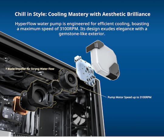 Με μια αντλία 3100RPM, η HyperFlow προσφέρει ταχεία απαγωγή θερμότητας διατηρώντας τα εξαρτήματα δροσερά υπό πίεση, ενώ παράλληλα προσθέτει μια μοντέρνα, εμπνευσμένη από πολύτιμους λίθους πινελιά.