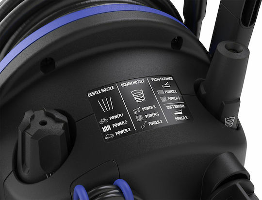 Πλυστικό μηχάνημα υψηλής πίεσης Nilfisk με έλεγχο ισχύος για ρυθμιζόμενη πίεση νερού. Η μεταλλική αντλία μεγάλης διάρκειας παρέχει τη δύναμη να καθαρίζει από μαλακές επιφάνειες έως και την δύσκολη βρωμιά.