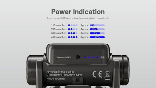 • Ενσωματωμένη επαναφορτιζόμενη μπαταρία ιόντων λιθίου 18650 / 4000mAh με αυξημένη χωρητικότητα.