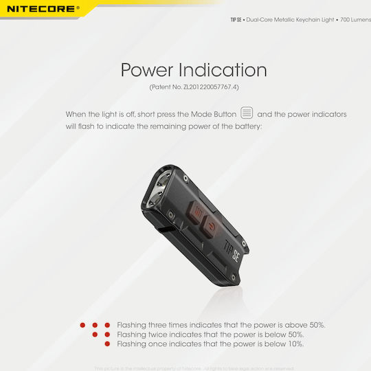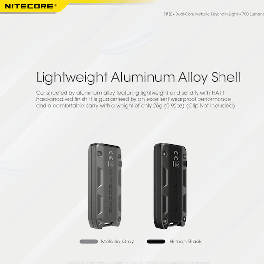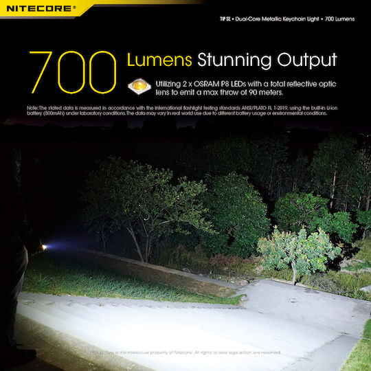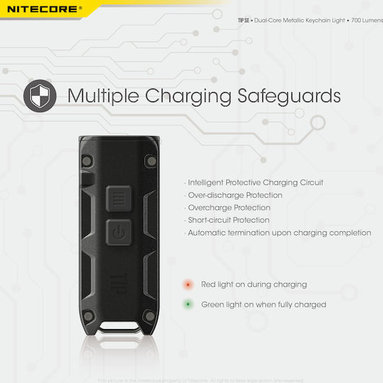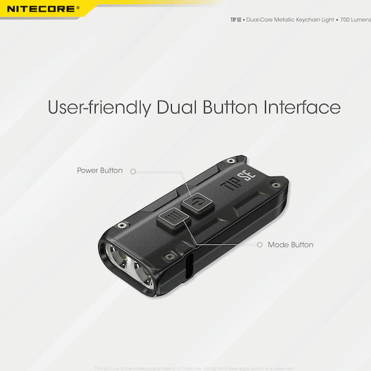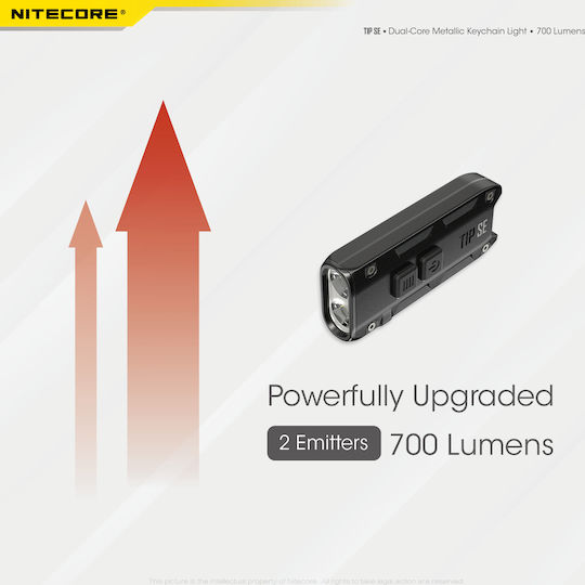 Φακός LED μπρελόκ επαναφορτιζόμενος 700 Lumens σε μαύρο της NITECORE, TIP SE. Με μεταλλικό περίβλημα από κράμα αλουμινίου και 2x LED OSRAM P83 που αποδίδουν έως και 700 Lumens, έως 2100 κεριά και απόσταση 90 μέτρα.