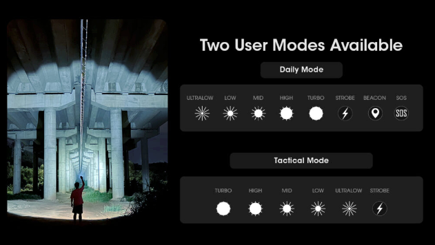 Ο φακός είναι επαναφορτιζόμενος με θύρα USB-C. Τροφοδοτείται από μία μπαταρία Li–ion 21700 με χωρητικότητα 5300mAh και συνεχόμενο ρεύμα αποφόρτισης 20Α, που τροφοδοτεί τον φακό για συνεχόμενη λειτουργία έως και 650 ώρες στο πολύ χαμηλό επίπεδο φωτισμού. Επιπλέον, διαθέτει ενδεικτική λυχνία κάτω από τον πλάγιο διακόπτη καταδεικνύει την ενέργεια που έχει απομείνει στην μπαταρία. Η ενδεικτική λυχνία μπορεί να εμφανίσει την τάση της μπαταρίας με ακρίβεια +/-0,1V.