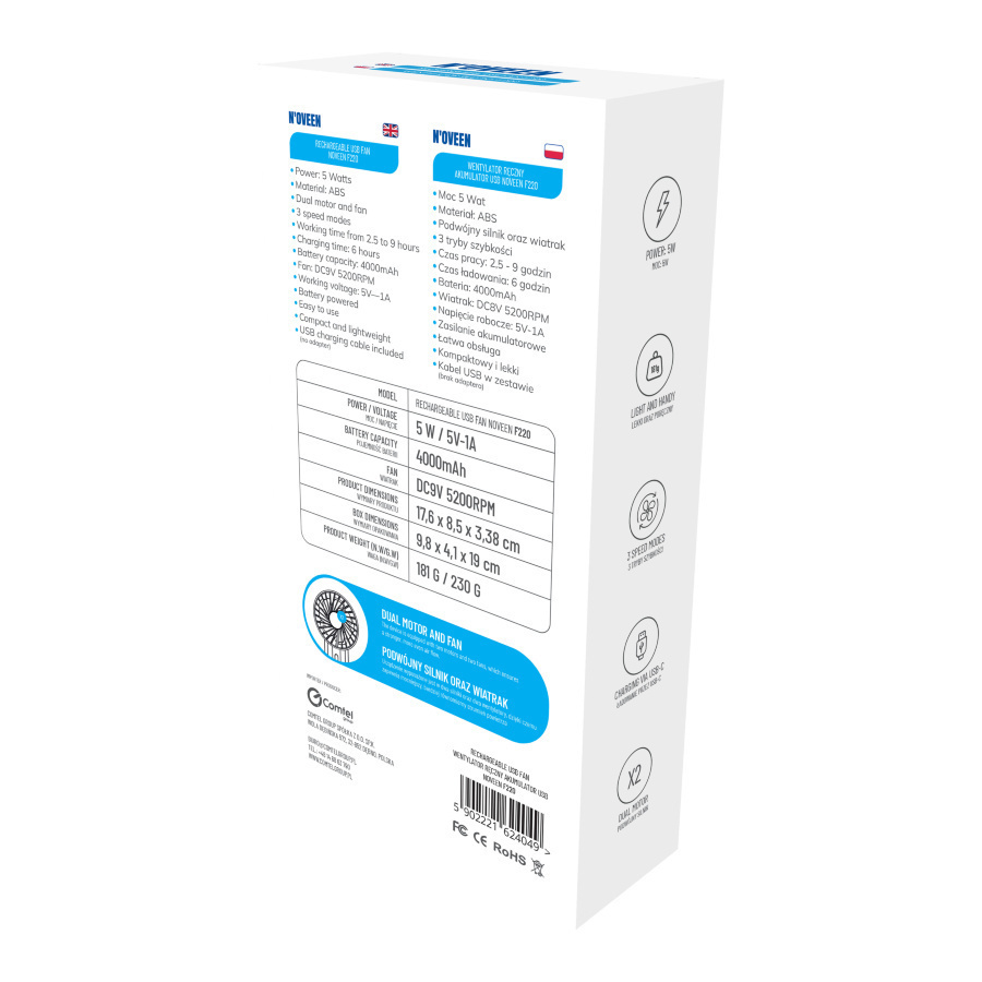 Ο φορητός ανεμιστήρας χειρός F220 είναι επαναφορτιζόμενος μέσω USB και διαθέτει: