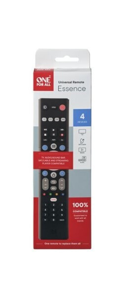 Το One for All Essence 4 in 1 Universal Fernbedienung (URC 1241) είναι ένα συμπαγές, εργονομικό τηλεχειριστήριο σχεδιασμένο να διαχειρίζεται έως τέσσερις διαφορετικές συσκευές ήχου και εικόνας. Αυτό το универсальное τηλεχειριστήριο απλοποιεί τη λειτουργία πολλών συσκευών στο σύστημα ψυχαγωγίας του σπιτιού σας.