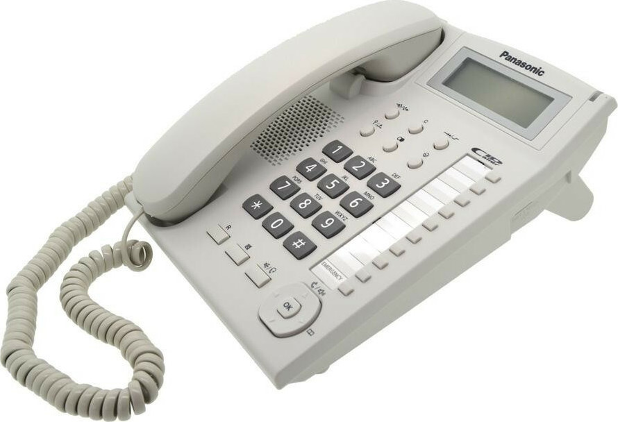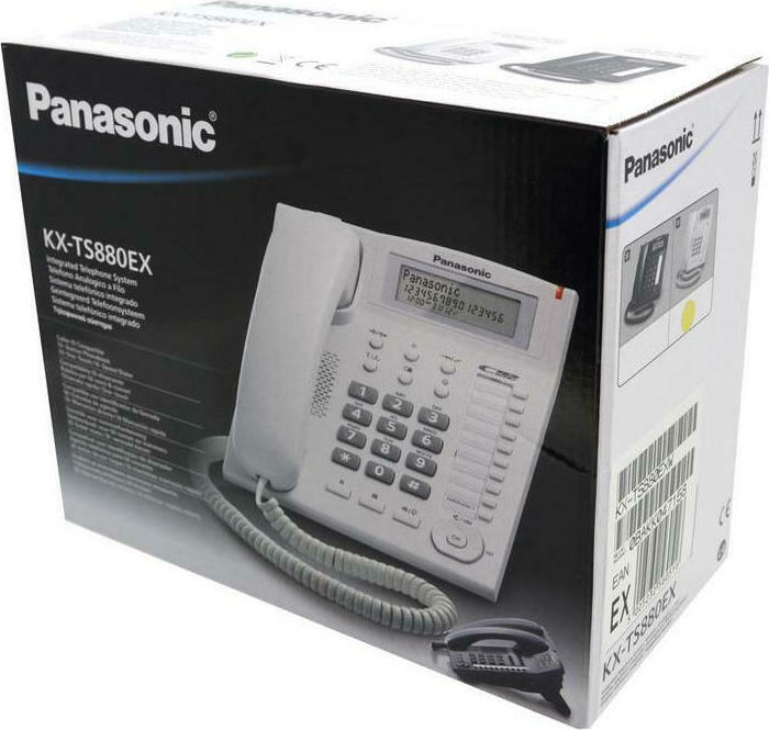 Ενσύρματη τηλεφωνική συσκευή Panasonic KX-TS880EX με οθόνη LCD τριών γραμμών με ρολόϊ, δυνατότητα αναγνώρισης ταυτότητας καλούντος, ανοικτή συνομιλία, Ελληνικό μενού, 10 πλήκτρα μνημών απευθείας κλήσης, 20 μνήμες με το πάτημα 2 πλήκτρων, λίστα 50 αναπάντητων κλήσεων, 50 μνήμες ταχείας κλήσης, 20 μνήμες επανάκλησης, αυτόματη επανάκληση.