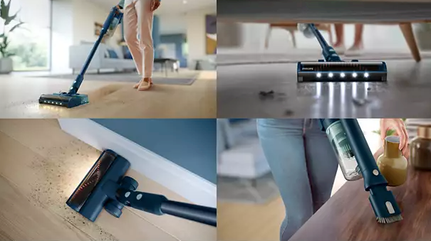 Το TriActive Multi LED ακροφύσιο σου φωτίζει με LED τα πατώματα και σου δείχνει ακριβώς πού κρύβεται η σκόνη. Καθαρίζει έως και 99,9% της βρωμιάς με μία κίνηση σε χαλιά και παρκέ, απομακρύνοντας σκόνη, τρίχες και χοντρά υπολείμματα, ακόμα και στις γωνιές μέχρι 3 χιλιοστά.