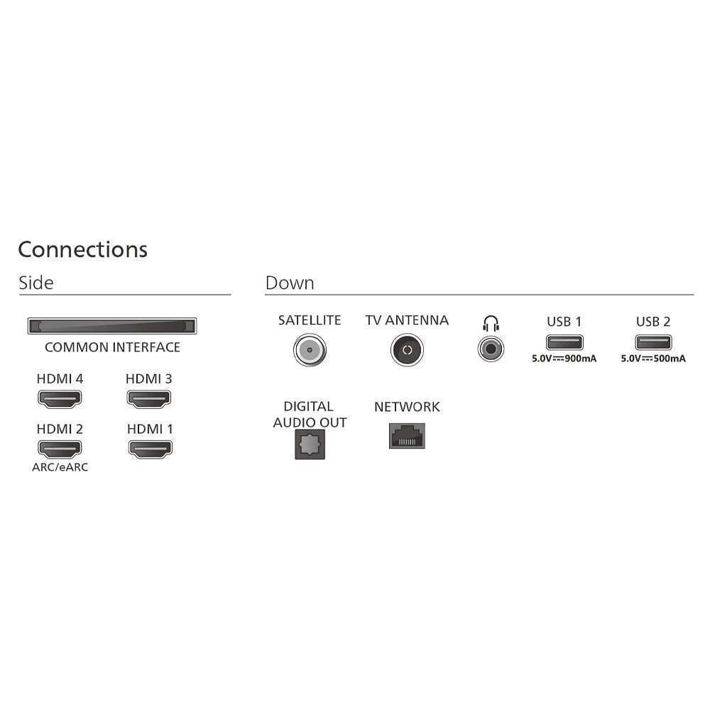 Η τηλεόραση διαθέτει τέσσερις θύρες HDMI, οι οποίες επιτρέπουν τη σύνδεση πολλαπλών συσκευών, όπως κονσόλες gaming και Blu-ray players. Επίσης, υποστηρίζει δύο θύρες USB για επιπλέον ευελιξία στη σύνδεση και αναπαραγωγή περιεχομένου.