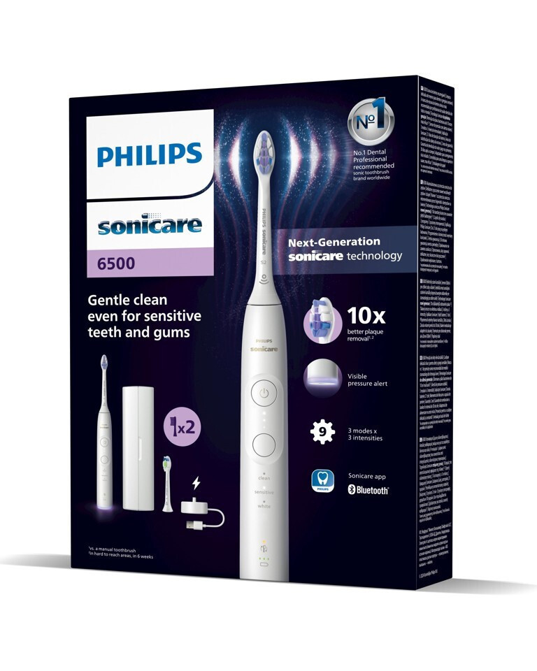 Η ηλεκτρική οδοντόβουρτσα Philips Sonicare 6500 προσφέρει απαλή βούρτσισμα, ακόμη και αν έχετε ευαίσθητα δόντια και ούλα. Διαθέτει καινοτόμο τεχνολογία Sonicare, ειδική ρύθμιση Sensitive και την ειδικά σχεδιασμένη κεφαλή βούρτσας S2 Sensitive.