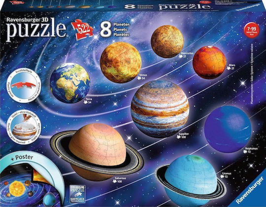 Ένα 3D παζλ υψηλής ποιότητας της Ravensburger που απεικονίζει το Ηλιακό μας Σύστημα. Αναπτύξτε την διακριτική ικανότητα, την παρατηρητικότητα, την υπομονή, την επιμονή, την ευστροφία και την δημιουργικότητα σας κατά την προσπάθεια ολοκλήρωσης της συνολικής εικόνας. Τα κομμάτια εφάπτονται τέλεια μεταξύ τους προσφέροντας μια ομαλή και ευχάριστη εμπειρία. Περάστε δημιουργικά το χρόνο σας, παίζοντας μόνος σας ή με την οικογένεια σας και ολοκληρώστε ένα υπέροχο παζλ που μπορεί να διακοσμήσει μετά τον χώρο ή το δωμάτιό σας.