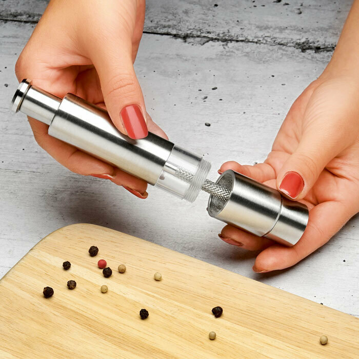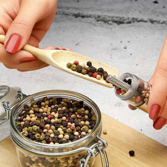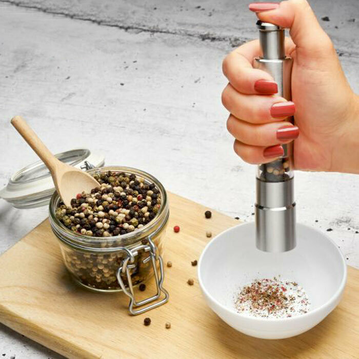- Υψηλής ποιότητας κύλινδρος άλεσης από ανοξείδωτο ατσάλι για αλάτι, πιπέρι αλλά και διάφορα μπαχαρικά, όπως κάρυ, σκόρδο κ.ά.