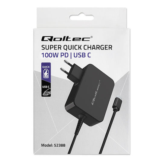 Qoltec Φορτιστής με Ενσωματωμένο Καλώδιο GaN USB-C 100W Power Delivery Μαύρος (Power Pro)