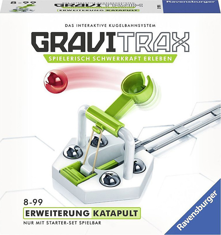 Το στοιχείο καταπέλτης GraviTrax κάνει ένα συναρπαστικό παιχνίδι με μπάλα! Εκτοξεύει τις μπάλες πάνω και πάνω από τα εμπόδια στην πίστα. Όταν μια μπάλα εισέρχεται στον καταπέλτη, ενεργοποιείται ένας μηχανισμός και ο βραχίονας και η μπάλα εκτοξεύονται προς τα πάνω για να πετάξουν τη μπάλα μακριά. Αν συνδυάσετε το στοιχείο Καταπέλτης με ένα σετ εκκίνησης GraviTrax, η διαδρομή με μπίλιες θα αποκτήσει νέα δυναμική και επιπλέον ενέργεια. Το GraviTrax είναι ένα σύστημα πίστας σφαιρών για παιδιά ηλικίας 8 ετών και άνω, το οποίο σας επιτρέπει να κατασκευάσετε τις δικές σας πίστες και να εξερευνήσετε τη συμπεριφορά κύλισης των σφαιρών. Το στοιχείο καταπέλτης GraviTrax είναι μια εξαιρετική προσθήκη.
