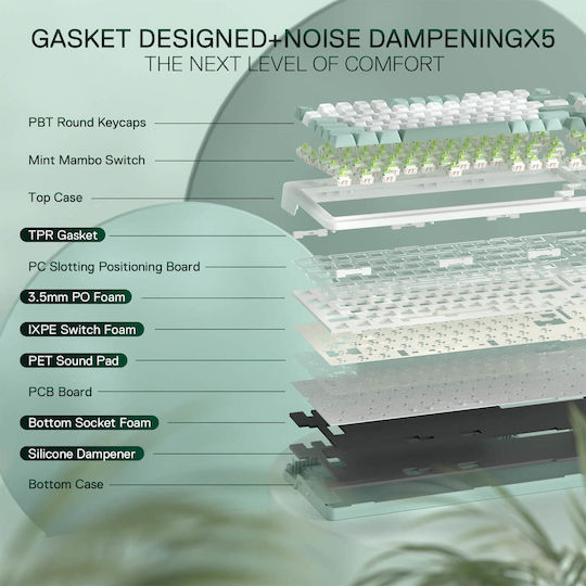 Η προηγμένη κατασκευή Gasket-Mount προσφέρει μια πιο μαλακή και ευχάριστη αίσθηση κατά την πληκτρολόγηση, μειώνοντας τους κραδασμούς και προσφέροντας ανώτερη ηχητική απόσβεση. Οι μηχανικοί διακόπτες Mambo Switch παρέχουν σταθερή και ισορροπημένη ενεργοποίηση, κάνοντας το πληκτρολόγιο εξαιρετικά αποδοτικό τόσο για πολύωρη συγγραφή κειμένων όσο και για έντονο gaming. Η Full-size διάταξη διασφαλίζει ότι έχετε όλα τα απαραίτητα πλήκτρα στη διάθεσή σας χωρίς συμβιβασμούς.